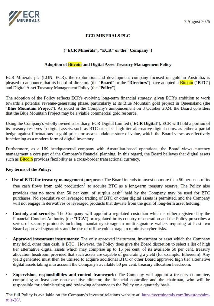 深潮 TechFlow 消息,8 月 7 日,据英国上市公司 ECR Minerals plc (LON: ECR) 公告披露,公司董事会已通过比特币和数字资产财务管理政策。根据该政策,ECR 将通过其全资子公司 ECR Digital Limited 持有部分数字资产储备。