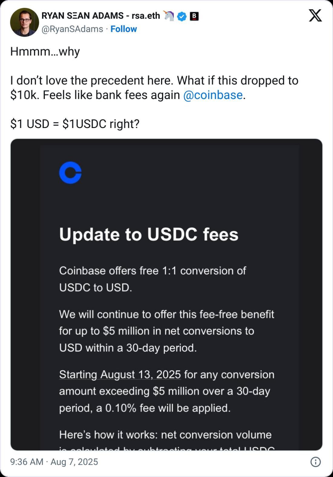 Coinbase 将对超 500 万美元的“USDC 兑换美元”交易收取 0.1% 费用