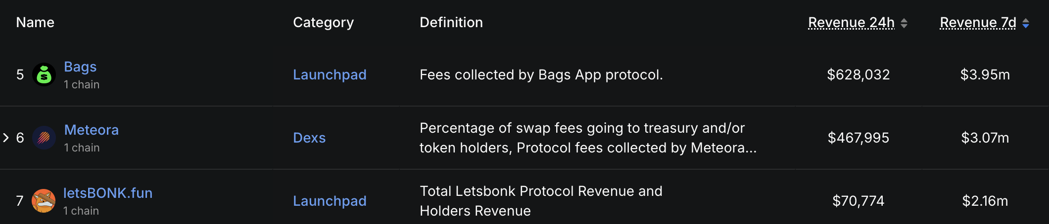 Solana生态Memecoin发射平台BAGS七日收入超越letsBONK.fun