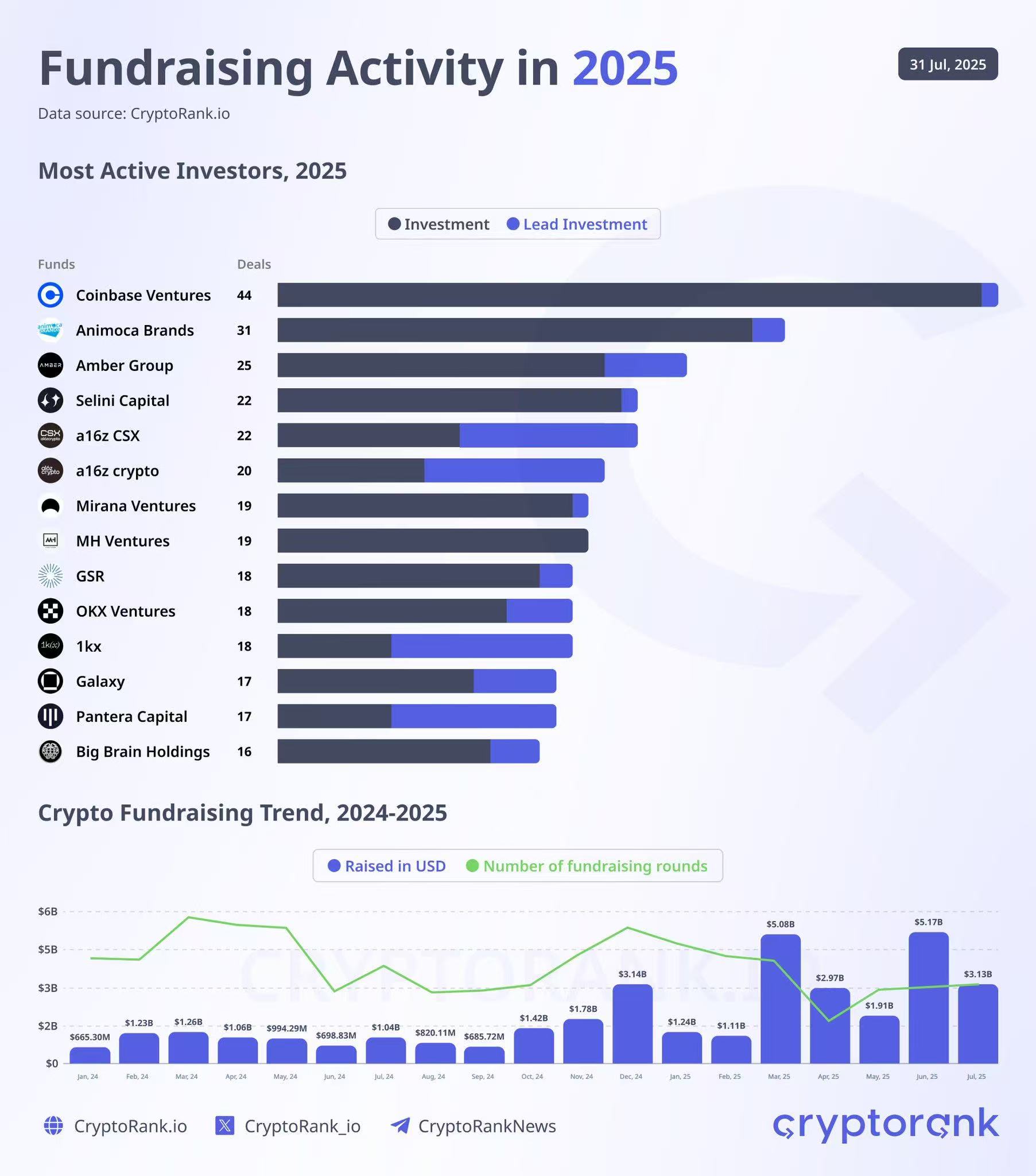 深潮 TechFlow 消息,8 月 11 日,据CryptoRank.io数据显示,截止2025年7月31日,加密项目融资规模达206亿,超越去年全年,并打破了之前每个周期的融资记录,其中Coinbase Ventures完成44笔交易位居投资机构首位,Animoca Brands和Amber Group分别以31笔和25笔交易位列第二、三位,Selini Capital与a16z CSX各完成22笔交易并列第四。
