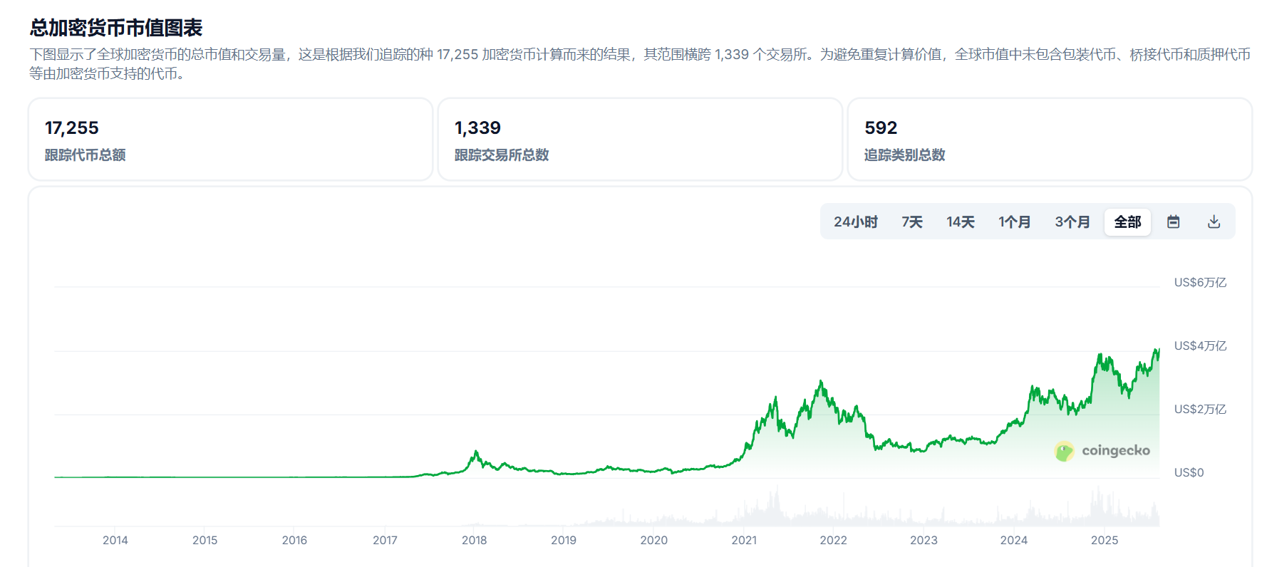 深潮 TechFlow 消息,8 月 11 日,据 Coingecko 数据,目前全网加密货币总市值已突破 4.1 万亿美元,现报 4,113,812,374,492 美元,24 小时涨幅为 2.0%,其中比特币占比降至 56.85%。