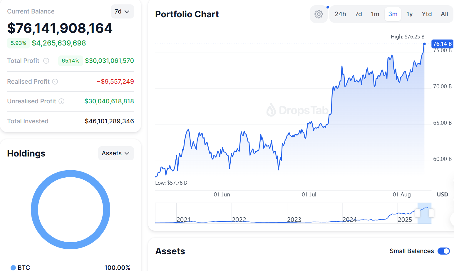 深潮 TechFlow 消息,8 月 11 日,据 Drops tab 数据,Strategy 目前在其BTC投资组合中拥有超过 300 亿美元的未实现利润。