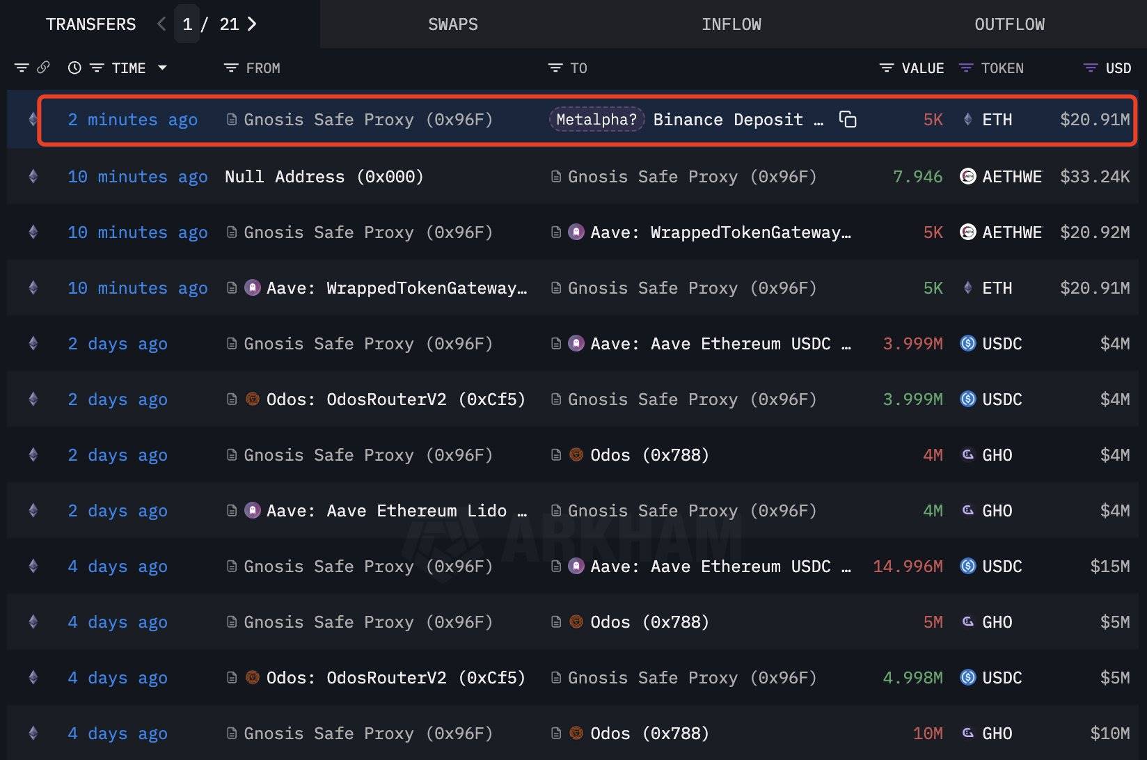 深潮 TechFlow 消息,8 月 11 日,据链上数据分析平台 Lookonchain 监测,一个与 Metalpha 相关的钱包地址刚刚向币安存入了 5,000 枚 ETH,价值约 2,091 万美元。