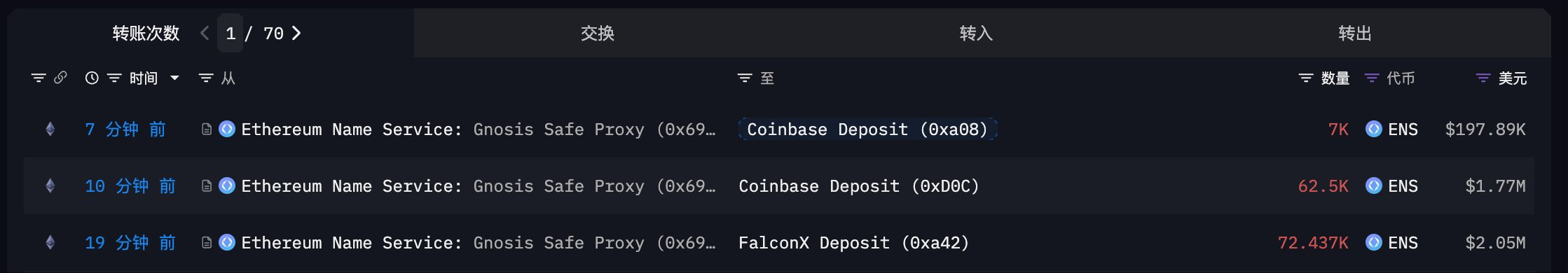 ENS 多签钱包在 20 分钟内转出近 14.2 万枚 ENS 至 FalconX 与 Coinbase