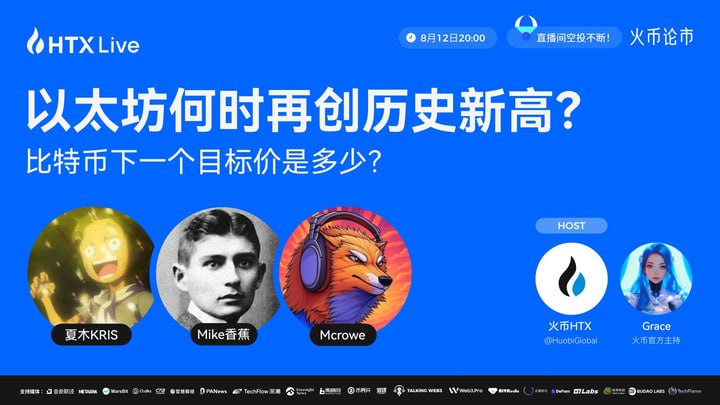 深潮 TechFlow 消息,8 月 12 日,据官方社媒消息,火币HTX将于今日20时举办“以太坊何时再创历史新高?比特币下一个目标价是多少?”主题直播。届时,夏木KRIS、Mike香蕉、Mcrowe等资深交易员将来带实时行情分析、投资建议与现场答疑。本次活动通过火币直播、X Space同步进行,更有红包雨不断,敬请期待。