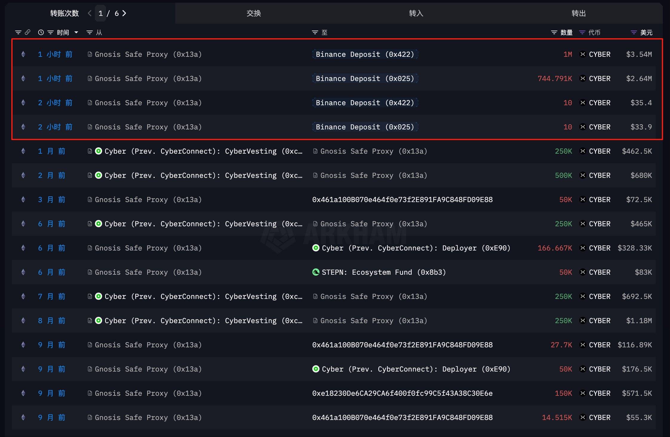 Cyber 多签钱包 1 小时前向币安转移 174.4 万枚 CYBER,约合 618 万美元