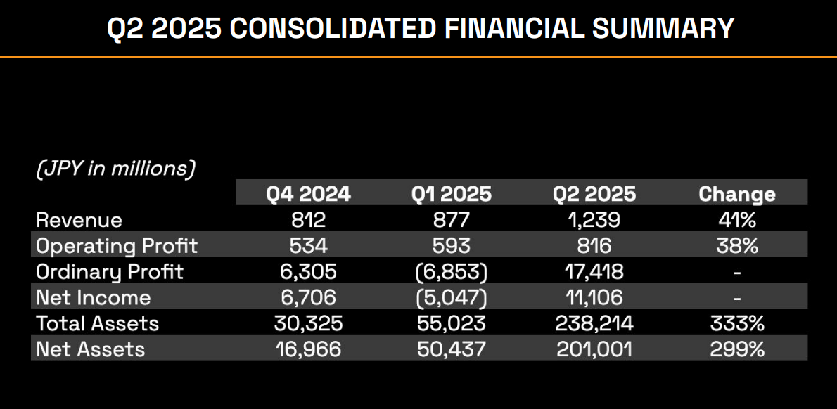 Metaplanet 2025年Q2财报:营收环比增长 41%,净资产环比增长 299%