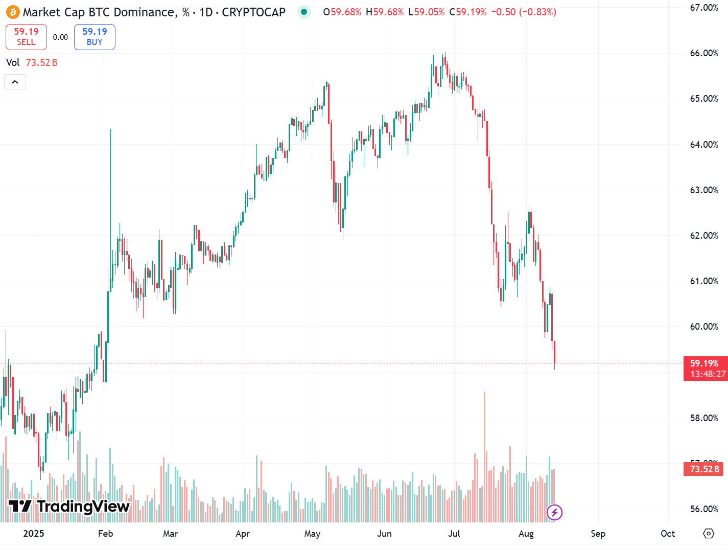 深潮 TechFlow 消息,8 月 13 日,据 TradingView 数据显示,比特币市占率出现持续回落并跌破 60%,现报 59.19%,创下今年 2 月以来新低。