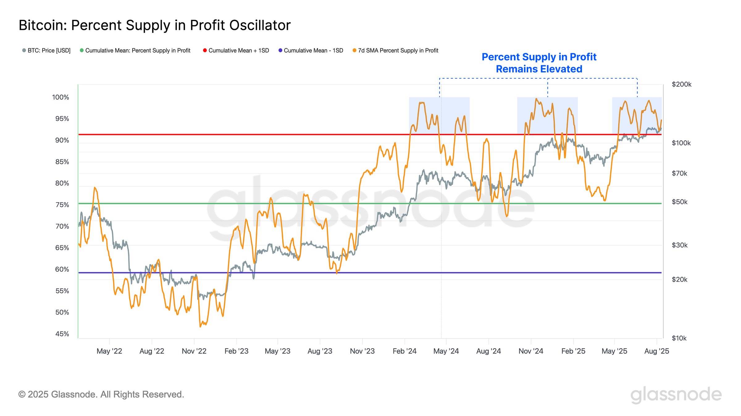 深潮 TechFlow 消息,8 月 14 日,Glassnode 在社交媒体发文称,目前 99% 的 BTC 供应量处于盈利状态。即使在 7 月份的市场调整期间,该指标仍保持在 95% 的高位。该指标在其 +1 标准差区间获得支撑,表明投资者继续围绕未实现收益进行锚定,反映出市场结构在波动中保持韧性。