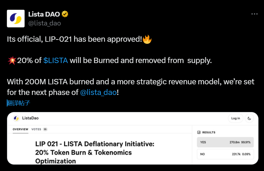 Lista DAO:LIP-021 提案获批,将销毁 20% 的 LISTA 代币