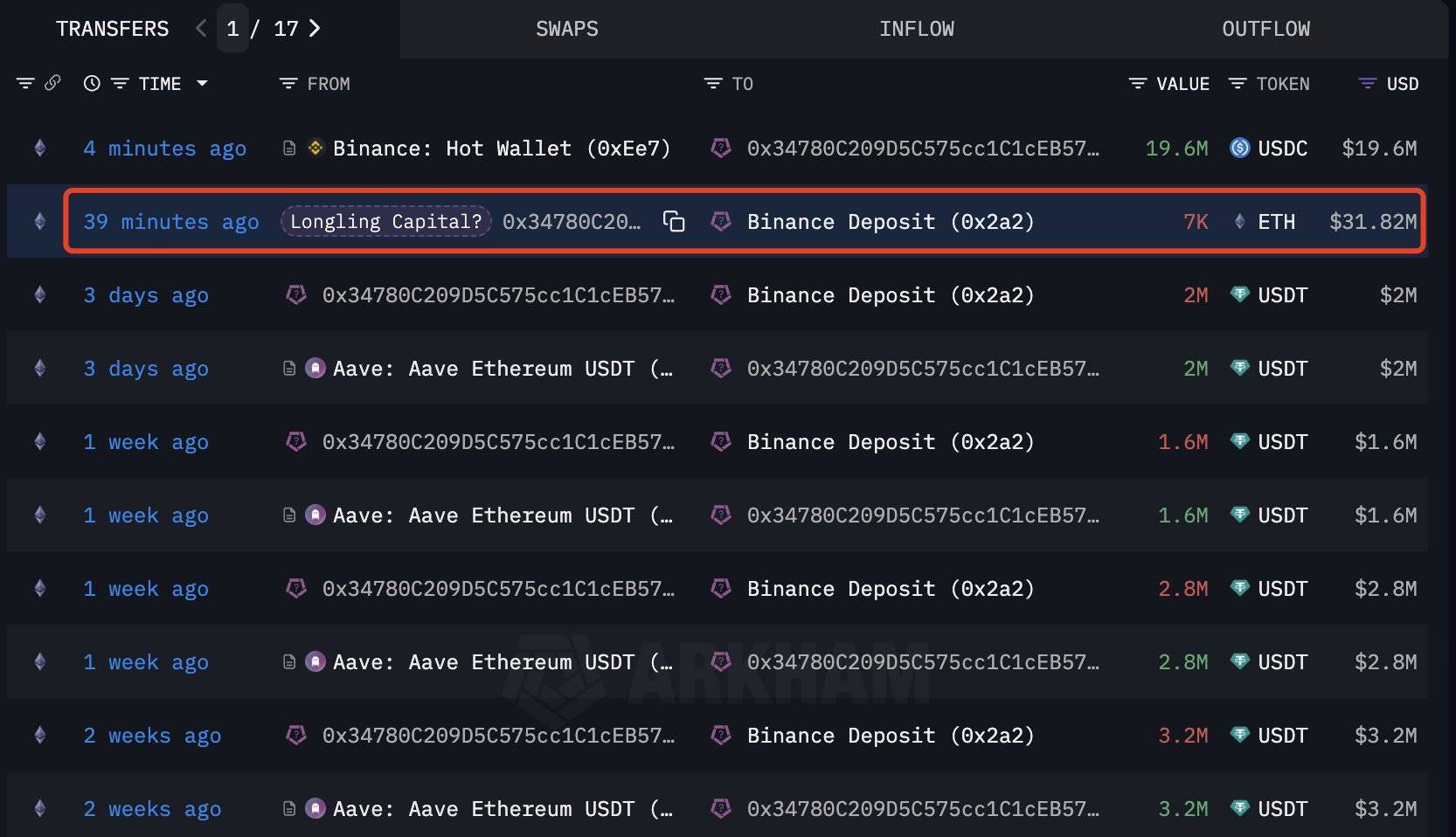 Longling Capital 关联地址约 40 分钟前抛售 7,000 枚以太坊,价值约 3,182 万美元