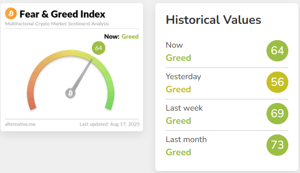 深潮 TechFlow 消息,8 月 17 日,据 Alternative.me 数据,今日加密货币恐慌与贪婪指数升至 64(昨日该指数为 56),表明市场仍处于「贪婪状态」。