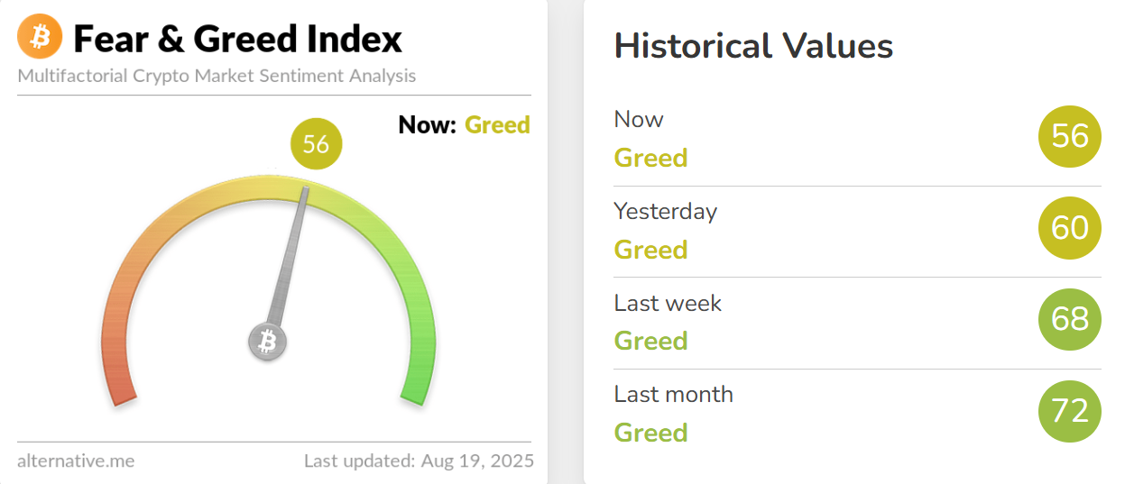 深潮 TechFlow 消息,8 月 19 日,据 Alternative.me 数据,今日加密货币恐慌与贪婪指数降至 56(昨日该指数为 60),表明市场仍处于「贪婪状态」。