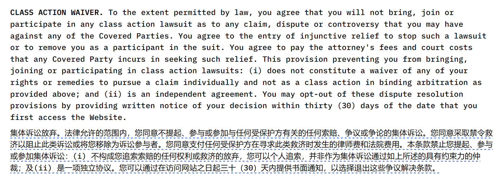 YZY 官方文档中包含“集体诉讼弃权”相关条款