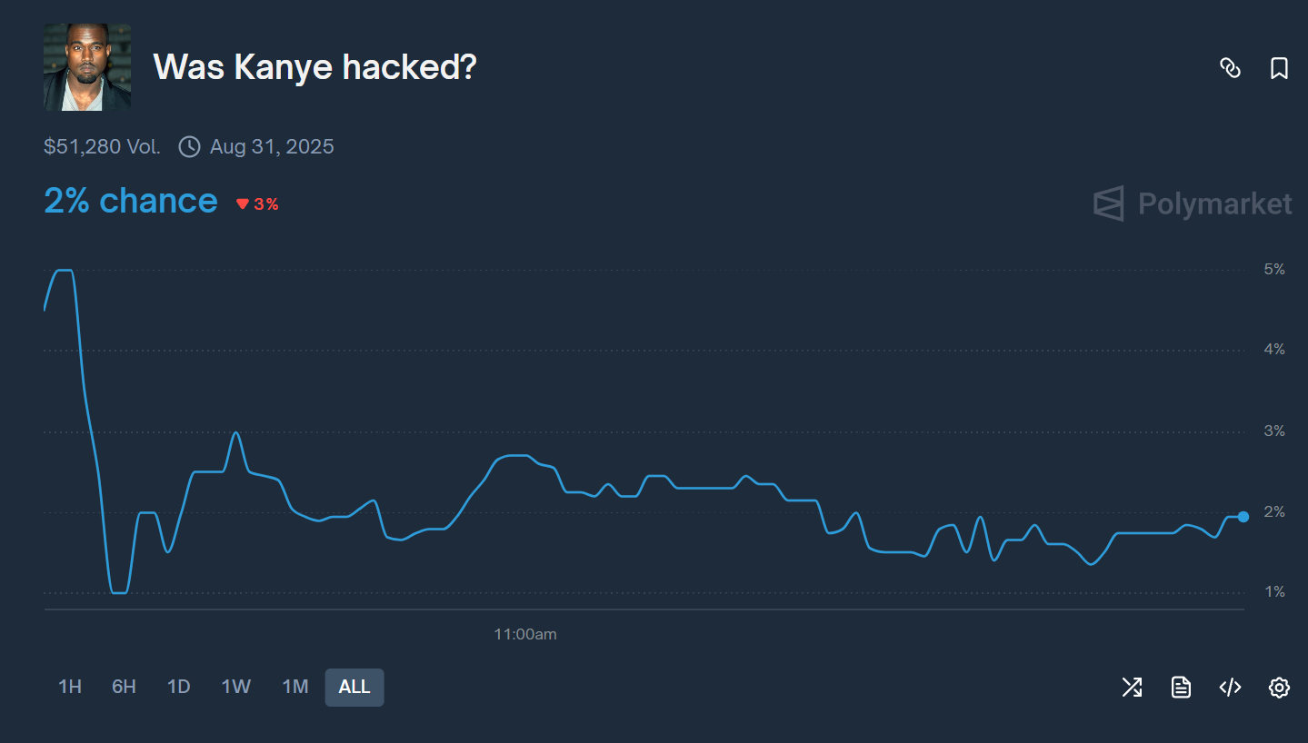 Polymarket 上仅 2% 参与资金认为侃爷官推被盗