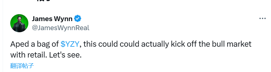 交易员 James Wynn:已买入YZY,其或将开启散户的牛市