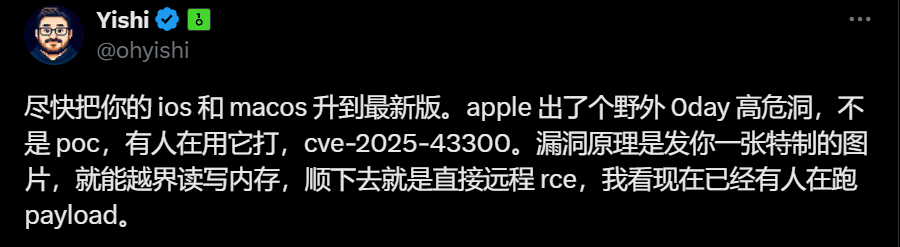 深潮 TechFlow 消息,8 月 22 日,OneKey 创始人 Yishi 在社交媒体发文表示,“苹果出现零日高危漏洞。尽快把你的 iOS 和 macOS 升到最新版,不是概念验证(Proof of Concept),有人在用它进行攻击,cve-2025-43300。漏洞原理是发你一张特制的图片,就能越界读写内存,顺下去就是直接远程代码执行(Remote Code Execution),我看现在已经有人在跑执行攻击代码(payload)。”