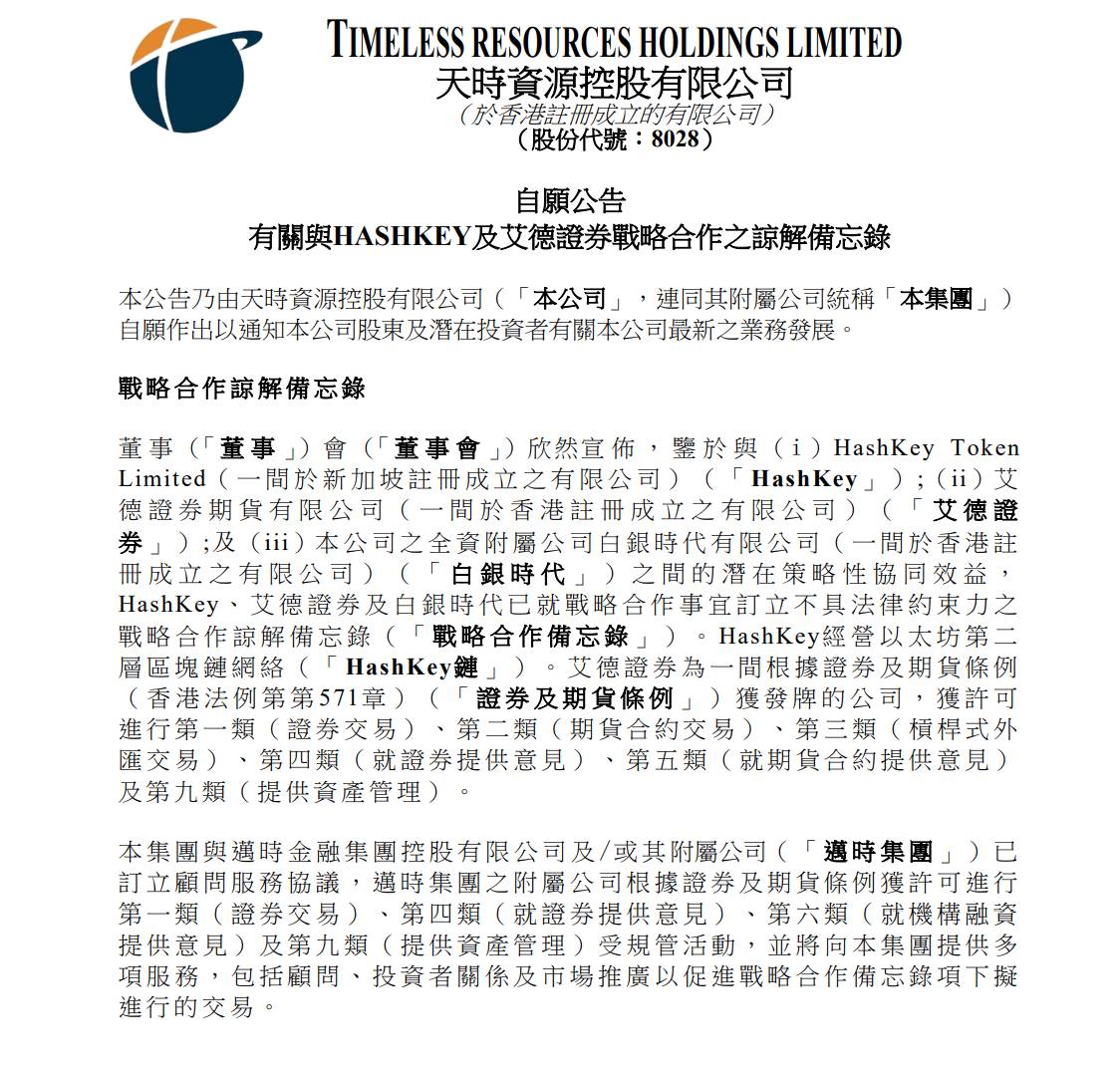 深潮 TechFlow 消息,8 月 22 日,据港交所公告,港股上市公司天时资源宣布将与艾德金融旗下艾德证券期货合作发行实体白银资产支持的数字代币(白银代币),推动香港首个白银代币化实体资产(RWA)项目。