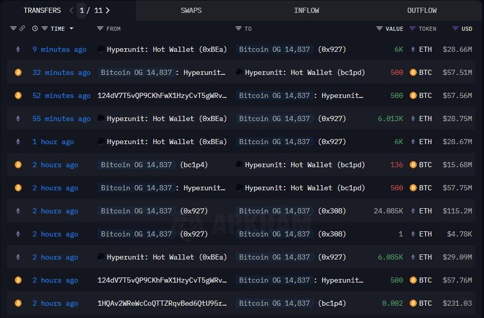 某比特币 OG 向 Hyperliquid 存入价值约 1.47 亿美元的比特币,持续换仓为 ETH