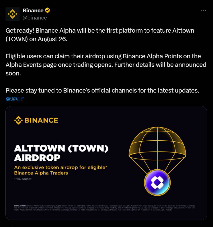 币安 Alpha 将在 8 月 26 日上线 Alttown (TOWN),符合条件的用户可申领空投
