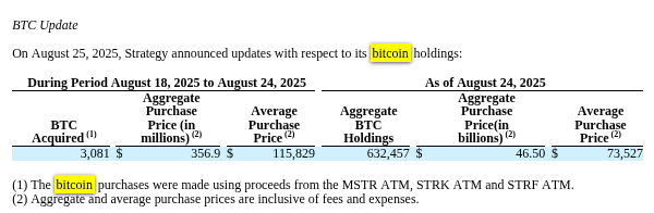 深潮 TechFlow 消息,8 月 25 日,据官方公告,Strategy 上周增持 3,081 枚 BTC,购买均价为 115,829 美元,价值 3.569 亿美元,当前总持仓量达 632,457 枚。