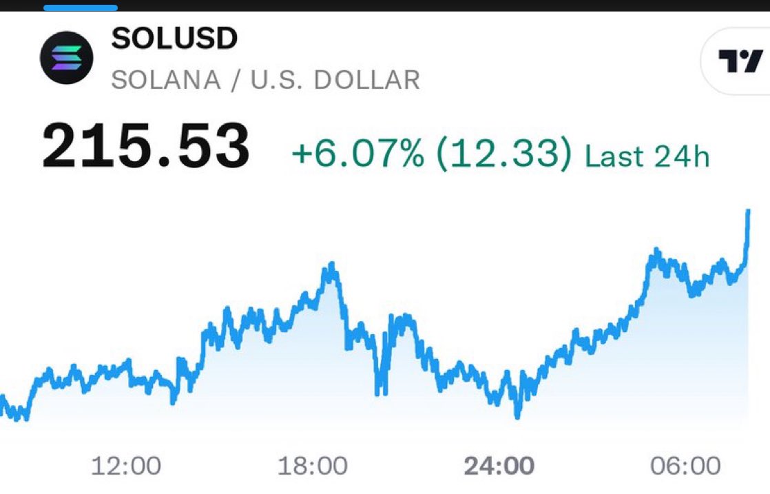 SOL 价格突破 215 美元,创下近 206 天的新高