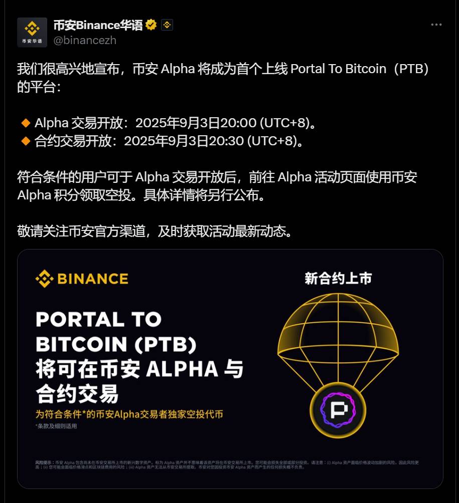 币安 Alpha 和合约将在 9 月 3 日上线 Portal To Bitcoin(PTB)
