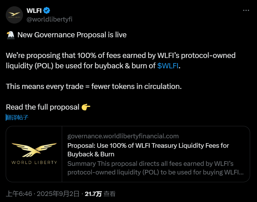 WLFI:提议将协议自有流动性产生的费用 100% 用于代币回购和销毁