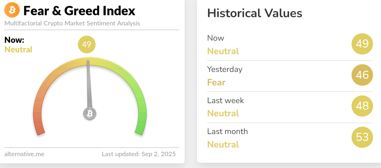 深潮 TechFlow 消息,9 月 2 日,据 Alternative.me 数据,今日加密货币恐慌与贪婪指数升至 49(昨日该指数为 46),表明市场由「恐慌状态」转为「中性状态」。
