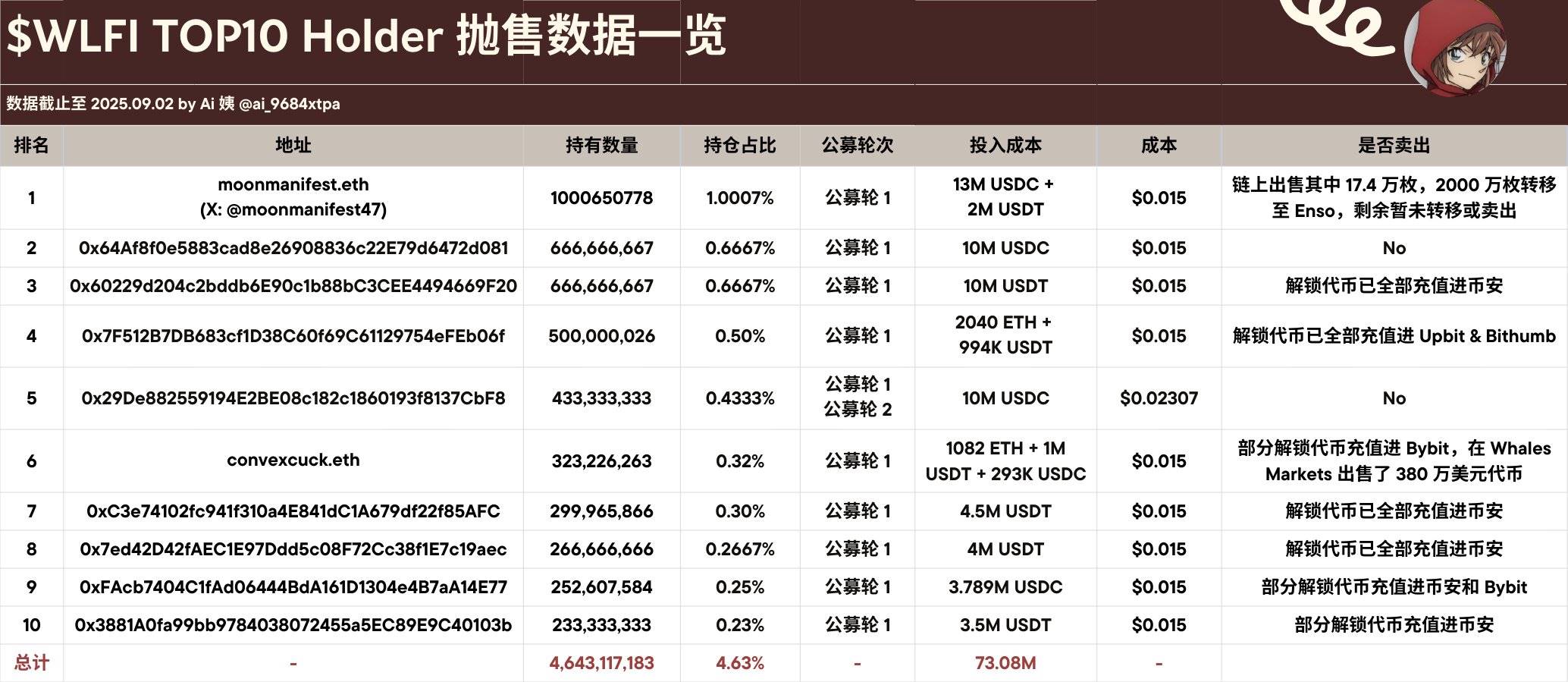 WLFI TOP10 个人持有者 80%已进行部分或全部减持,最大持有者仍保留大部分仓位