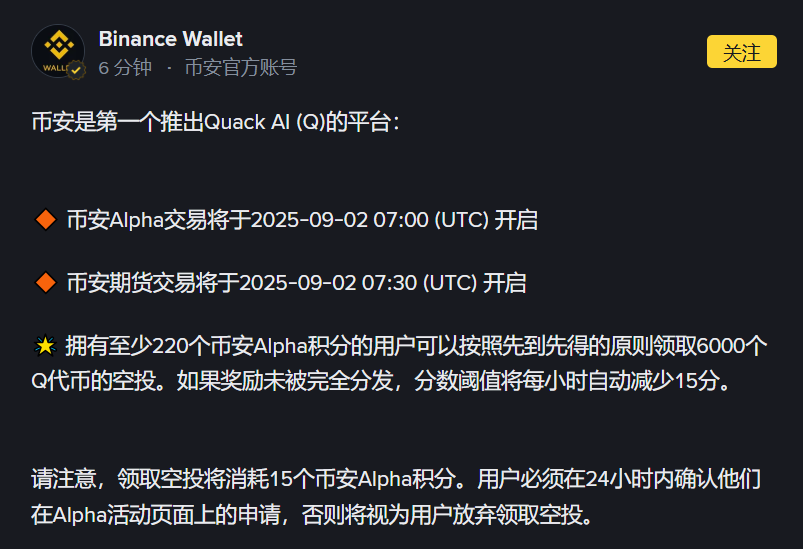 币安:Quack AI(Q)空投申领门槛为 220 分 Alpha 积分