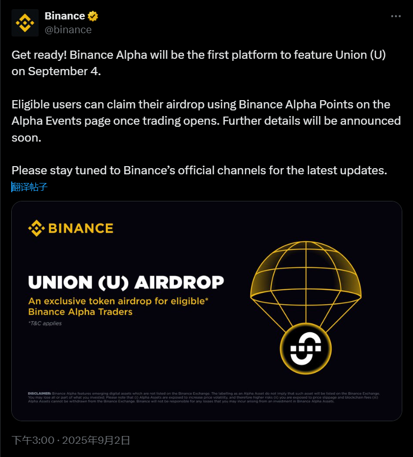 币安 Alpha 将于 9 月 4 日上线 Union (U),符合条件的用户可申领空投