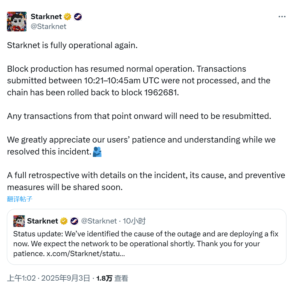 Starknet 已于昨日凌晨恢复正常运行,链上数据回滚至区块 1962681