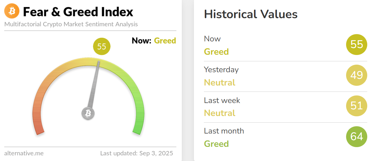 今日恐慌与贪婪指数升至 55,由「中性状态」转为「贪婪状态」