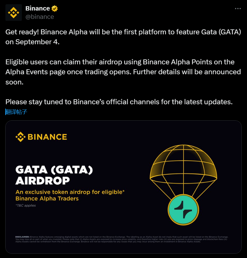 币安 Alpha 将于 9 月 4 日上线 Gata (GATA),符合条件的用户可申领空投