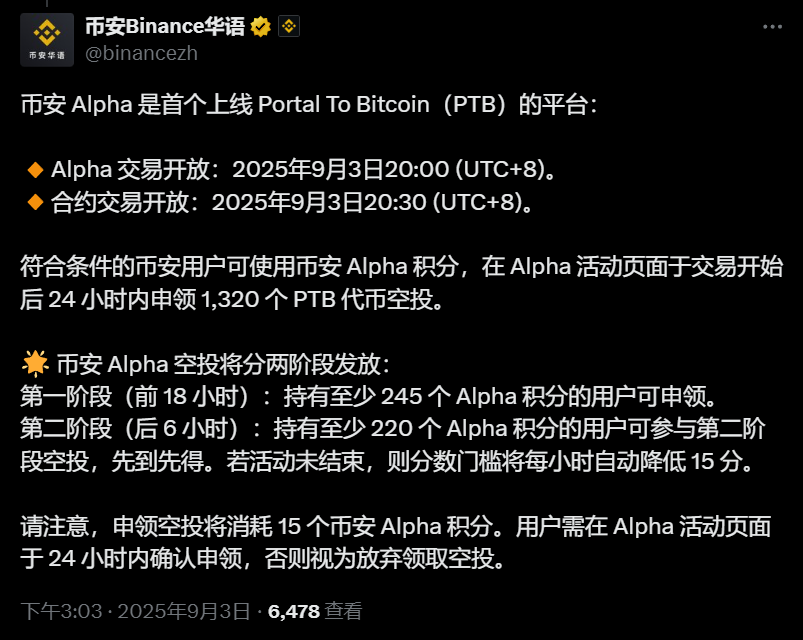 深潮 TechFlow 消息,9 月 3 日,据官方公告,币安 Alpha 是首个上线 Portal To Bitcoin(PTB)的平台: