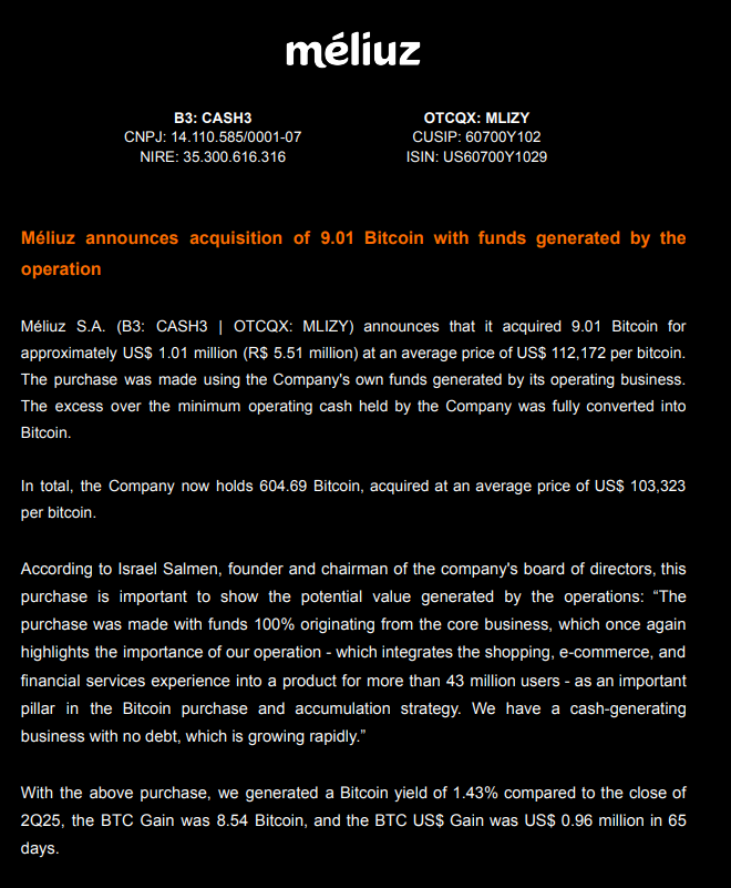 巴西上市公司 Méliuz 增持 9.01 枚 BTC,总持仓达 604.69 枚