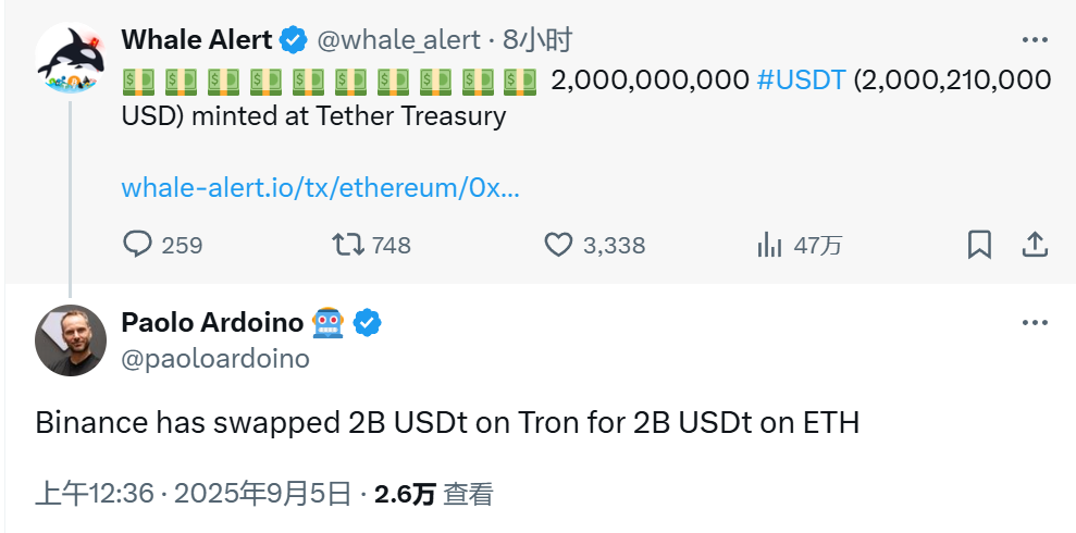 深潮 TechFlow 消息,9 月 5 日,Whale Alert 昨夜监测到 Tether Treasury 在以太坊上新铸造 20 亿枚 USDT。对此,Tether CEO Paolo Ardoino 回应称,“Binance 已将 20 亿枚 USDT 从 Tron 链换为以太坊链上的 20 亿枚 USDT。”