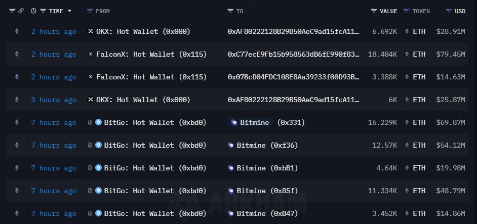 Bitmine 约 7 小时前再度增持 48,225 枚 ETH,约合 2.0754 亿美元