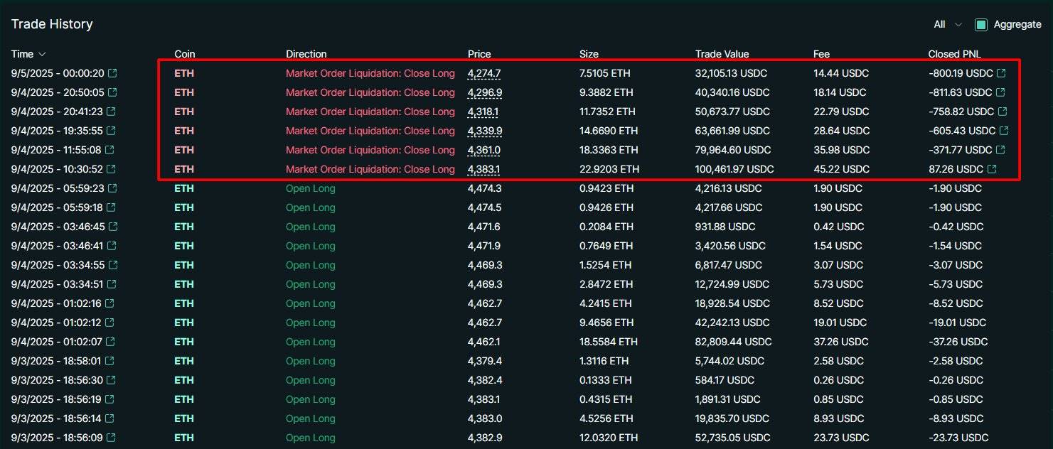 深潮 TechFlow 消息,9 月 5 日,据链上分析师 Onchain Lens(@OnchainLens)监测,交易者 James Wynn(@JamesWynnReal)在以太坊(ETH)25 倍杠杆多头仓位上连续遭遇 6 次清算。