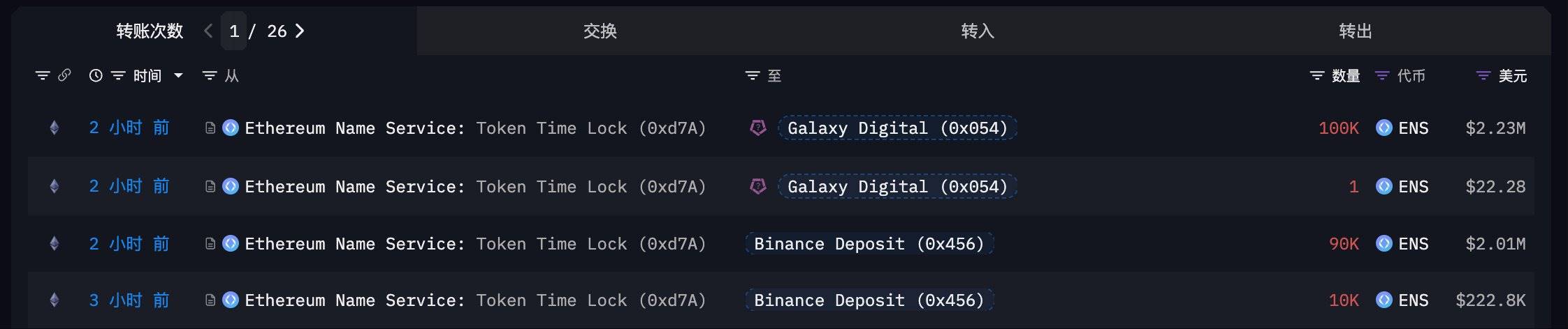 20 万枚 ENS 代币从时间锁合约转出至 Binance 和 Galaxy Digital,价值约 446 万美元