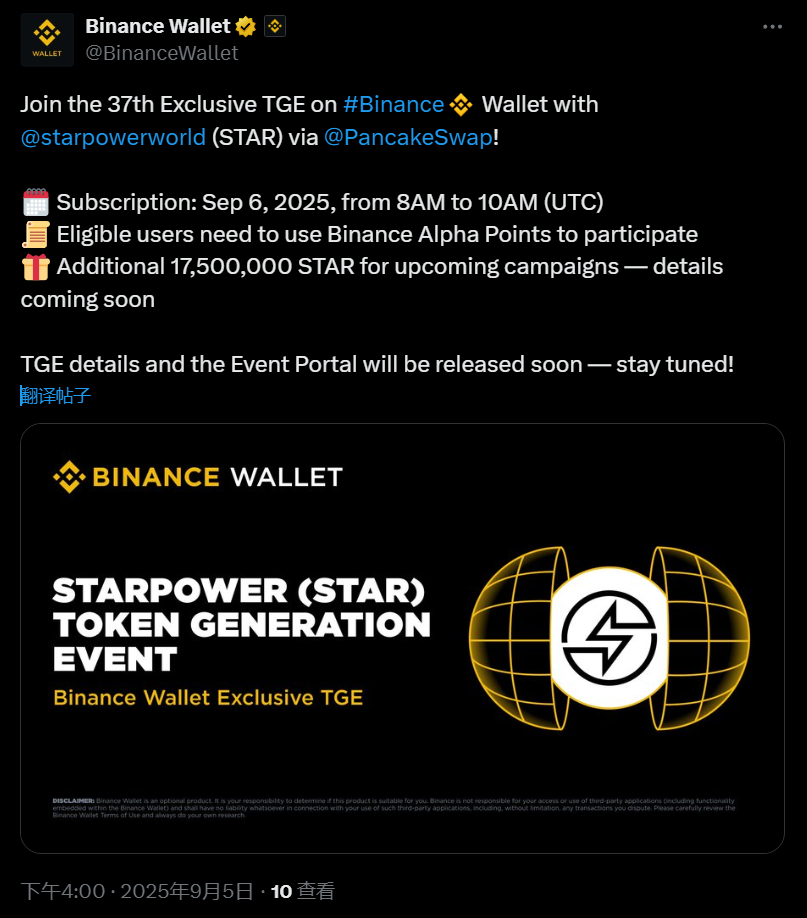 币安钱包将于9月6日上线 Starpower(STAR) 独家 TGE活动