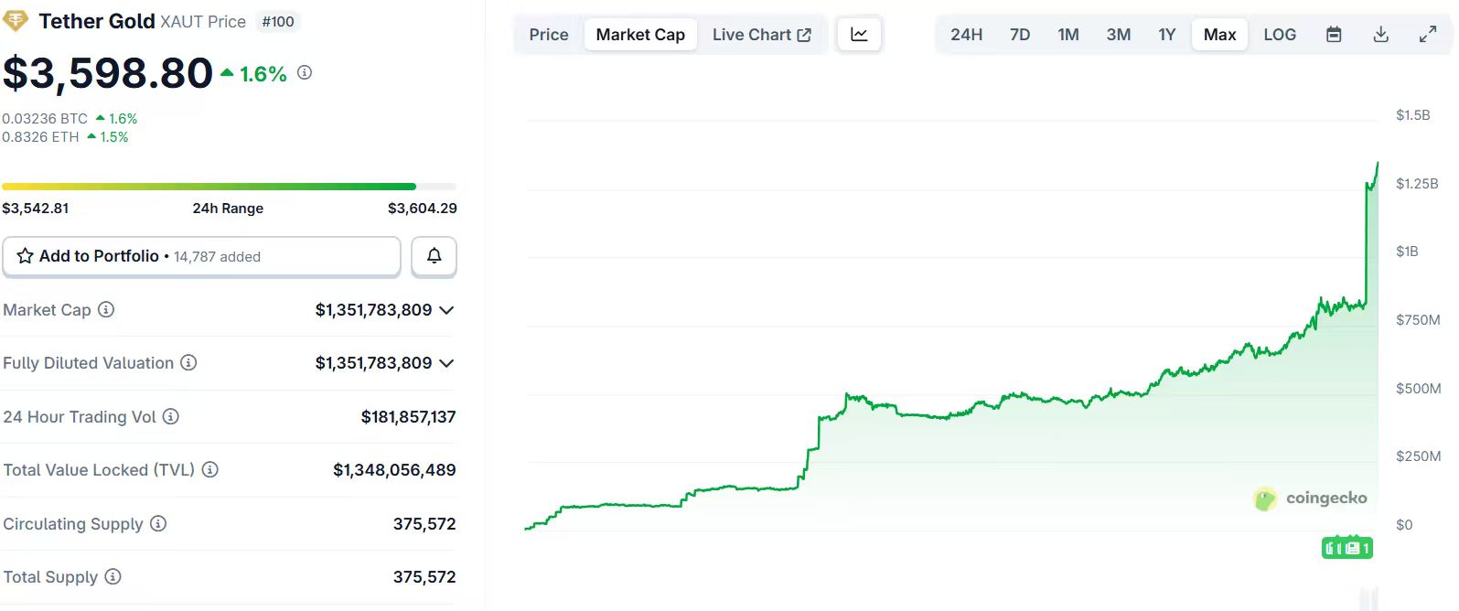 深潮 TechFlow 消息,9 月 6 日,据英国《金融时报》报道,Tether计划对黄金特许权使用费上市公司Elemental Altus进行追加投资,预计投资金额约1亿美元,使其持股比例提升至约 37.8%,相关交易或将在今年四季度完成。此外还与英属维尔京群岛的黄金开采投资工具Terranova Resources进行了谈判,但未达成交易。Tether于今年六月收购Elemental Altus近32%的股权,旨在将黄金和比特币等长期稳定的资产整合到其生态系统中。另据Coingecko最新数据显示,Tether运营的黄金支持加密代币XAUT市值已突破13.5亿美元,当前触及1,351,783,809美元,续创历史新高,流通供应量为375,572枚,过去24小时交易额达181,857,137美元。