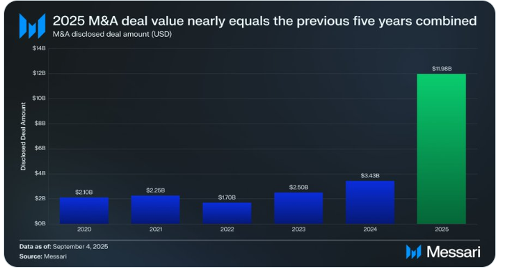 深潮 TechFlow 消息,9 月 6 日,Messari 数据显示,2025 年加密行业并购(M&A)规模有望与过去五年总和持平。截至目前,已披露交易额达 119.8 亿美元,是 2020 至 2023 年任意单一年份的三倍以上。