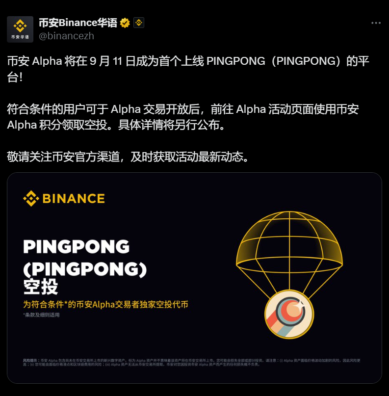 币安 Alpha 将在 9 月 11 日上线 PINGPONG(PINGPONG),符合条件的用户可申领空投