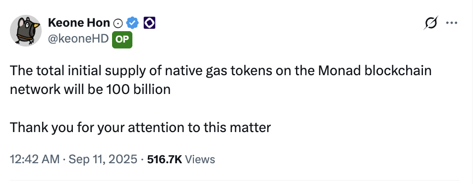 深潮 TechFlow 消息,9 月 11 日,Monad 联合创始人 Keone Hon 在 X 社交平台发文表示「Monad 链上原生 Gas 代币初始总供应量为 1000 亿枚。」