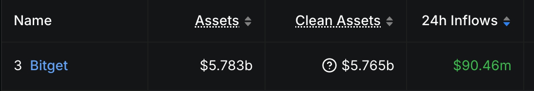 深潮 TechFlow 消息,9 月 11 日,昨日 Bitget 推出合约交易抽奖活动,百万购机补贴抽 30 部 iPhone 17 Pro Max。或受该活动影响,DefiLlama 数据显示,Bitget 平台 24 小时资金流入量达 9,046 万美元,位列全球 CEX 第三位。