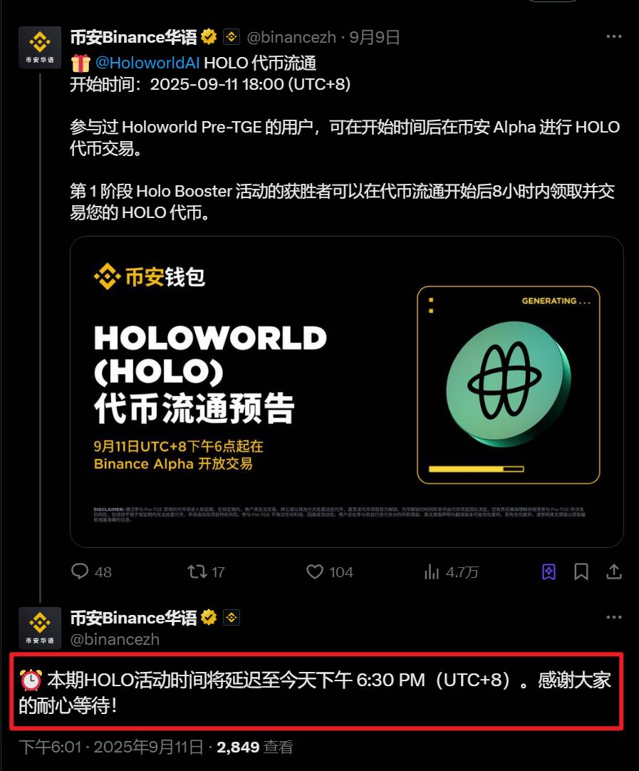 深潮 TechFlow 消息,9 月 11 日,据官方公告,币安本期HOLO活动时间将延迟至今天下午 6:30 PM(UTC+8)。