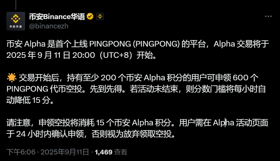 交易开始后,持有至少 200 个币安 Alpha 积分的用户可申领 600 个 PINGPONG 代币空投。先到先得。若活动未结束,则分数门槛将每小时自动降低 15 分。