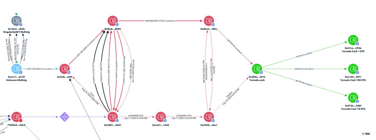 攻击者将盗取的USDC兑换为以太坊(ETH),随后立即将资金存入混币协议Tornado Cash进行洗钱。